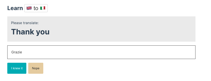 We will create an app that follows the method described above. The app will show you a phrase and you can tell it if you know the translation or not by selecting "I knew it" or "I didn't know it".